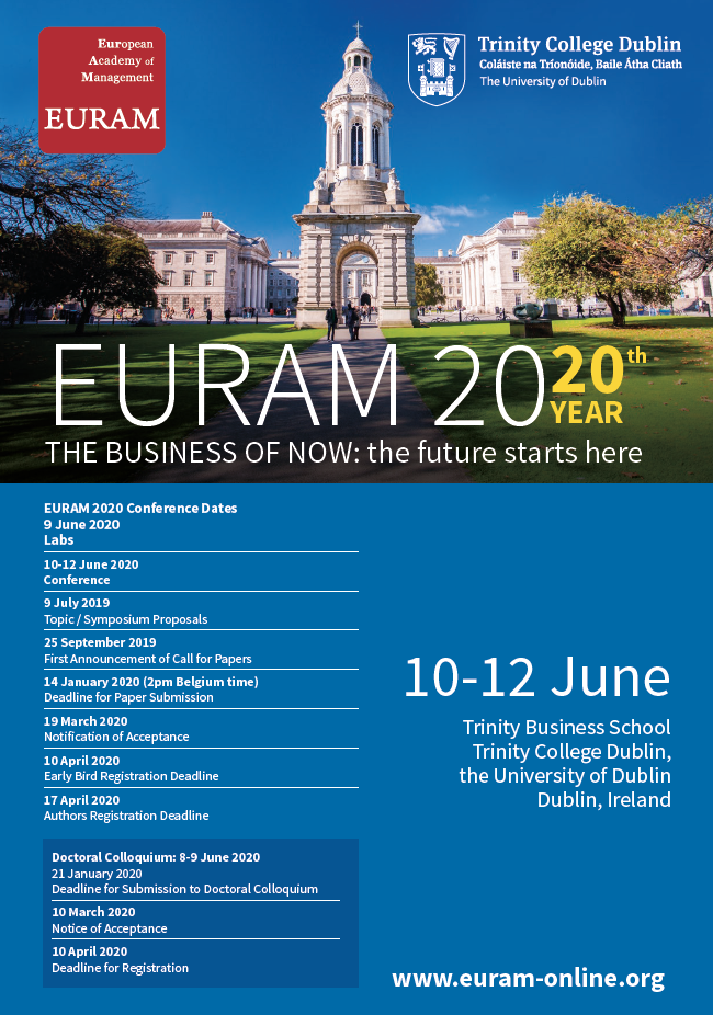 Please consult http://www.euramonline.org/annual-conference-2020.html/ for general information about the EURAM 2020 Doctoral Colloquium and Conference. Also, follow us on Facebook (https://www.facebook.com/euram.eecc) and Twitter (https://twitter.com/EURAM_BXL) and LinkedIn (https://www.linkedin.com/groups/8414395/ )