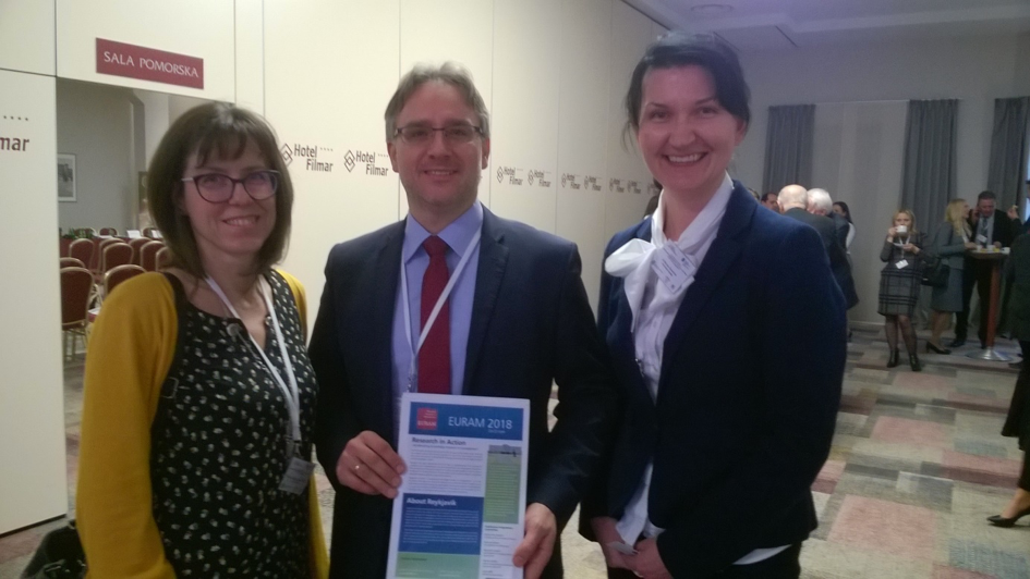from left to right: Aldona Glińska-Neweś (Dean for International Relations, current EURAM member), Maciej Zastempowski(Dean for Research) and Marzena herself.